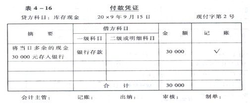 (2)付款憑證。付款憑證是指用于記錄現(xiàn)金和銀行存款付款業(yè)務(wù)的會計憑證。