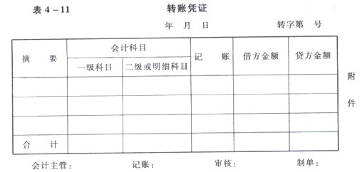 轉(zhuǎn)賬憑證是用于不涉及現(xiàn)金和銀行存款收付業(yè)務(wù)的其他轉(zhuǎn)賬業(yè)務(wù)所用的記賬憑證。一般格式如教材表4-11所示。