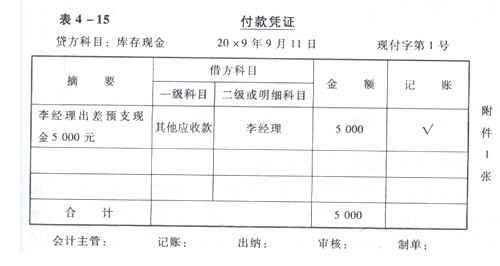 經(jīng)濟(jì)業(yè)務(wù):2009年9月11日李經(jīng)理出差預(yù)借差旅費(fèi)5000元,以現(xiàn)金支付。分錄如下: