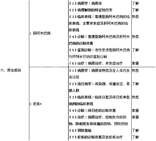 6.傳染性非典型肺炎 | (1)病原特點(diǎn) (2)流行病學(xué)特點(diǎn) (3)臨床表現(xiàn) (4)診斷依據(jù) (5)治療 | 了解 熟悉 熟悉 熟悉 熟悉 |