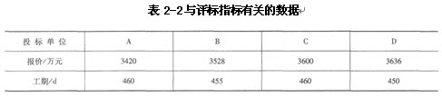 某公開招標(biāo)項(xiàng)目,現(xiàn)有A、B、C、D四家經(jīng)資格審查合格的施工企業(yè)參加該工程投標(biāo),與評(píng)標(biāo)指標(biāo)有關(guān)的數(shù)據(jù)見表2-2。