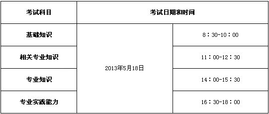 2013年內科主治醫師考試時間確定為2013年5月18日,具體考試安排如下: