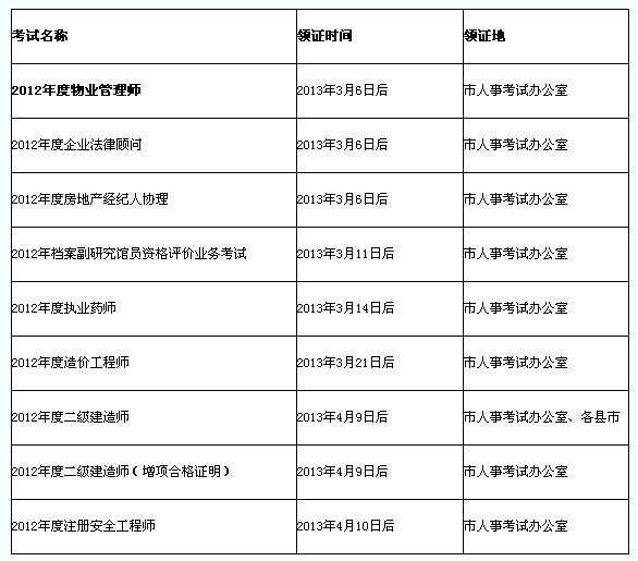 特別提醒:通過職稱外語(yǔ)、經(jīng)濟(jì)、二級(jí)建造師、藥學(xué)、醫(yī)療器械、檔案考試的各縣(市)考生,合格證書到當(dāng)?shù)厝肆Y源和社會(huì)保障局領(lǐng)取。(具體領(lǐng)證時(shí)間見下表)