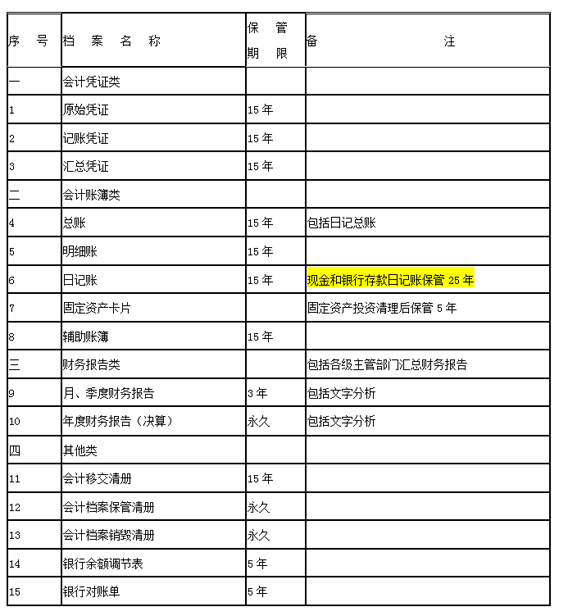 會計檔案的定期保管期限分為:3年、5年、10年、15年、25年和永久。(熟記企業的檔案保管時間)企業和其他組織會計檔案保管期限表