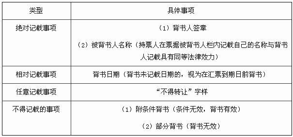背書是一種要式行為,因此必須符合法定的形式。背書的記載事項(xiàng)包括:
