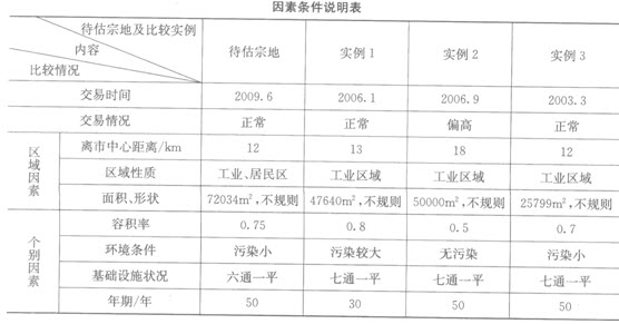 3.因素條件說明待估宗地和比較實例的各因素條件說明如下表。