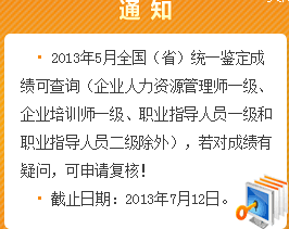 根據浙江省職業資格工作網的通知,浙江省2013年5月全國(省)統一鑒定成績可查詢(企業人力資源管理師一級、企業培訓師一級、職業指導人員一級和職業指導人員二級除外),若對成績有疑問,可申請復核!