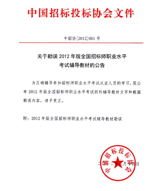 關于勘誤2012年版全國招標師職業水平考試輔導教材的公告