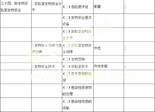 | 三十八、微生物學(xué)檢驗(yàn)的質(zhì)量保證 | 1.檢驗(yàn)前質(zhì)量保證 | (1)檢驗(yàn)申請(qǐng) | 掌握 | 2,3 |