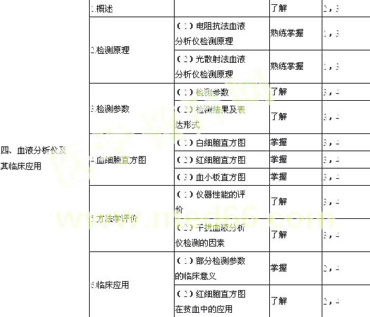 | 3.白細(xì)胞分類計(jì)數(shù) | (1)檢測原理 | 了解 | 1,3 | |