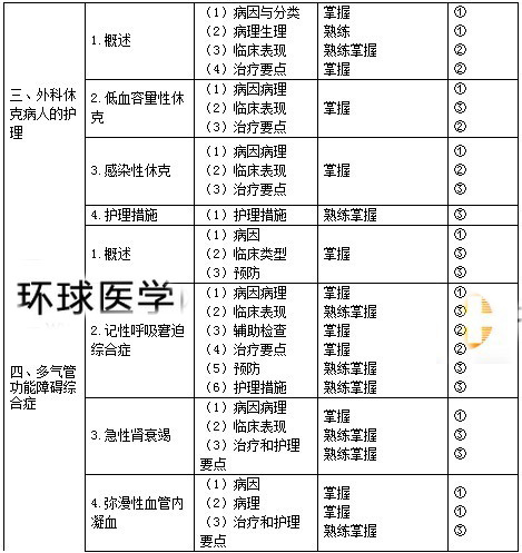 | 2.重癥病人的監測和護理 | (1)血流動力學的監測和護理 (2)呼吸功能的監測 (3)其他系統及臟器功能的監護 | 熟練掌握 掌握 掌握 | ③ | |