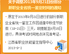 由江西省職業資格工作網得知,原定于2013年9月21進行的部分新職業全省統一鑒定工作因適逢中秋佳節放假(19-21)三天,故提前至9月15日進行,具體考試時間地點詳見準考證。