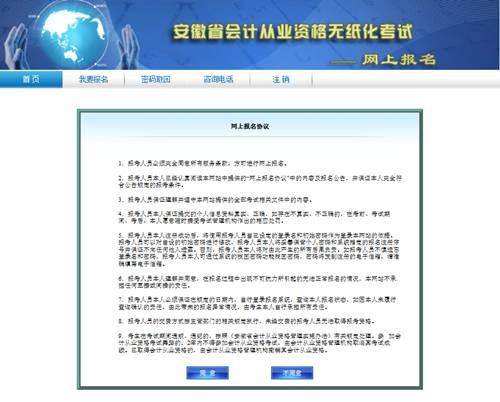 單擊“注冊”按鈕之后,進入到網上報名協(xié)議閱讀界面,選擇“同意”,進入到網上報名流程圖界面。
