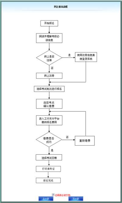 網上報名流程界面,呈現的是考生整個報名注冊的一個流程圖,勾選“已閱讀必讀文檔”,單擊“下一步”按鈕,如下圖: