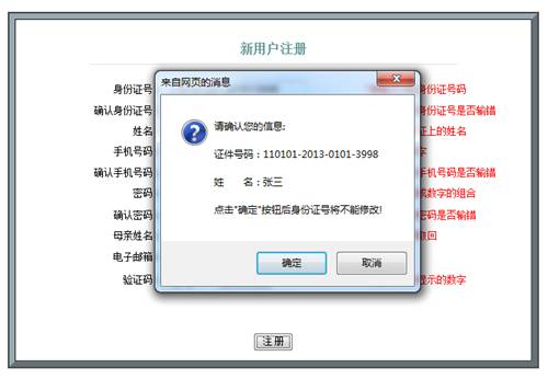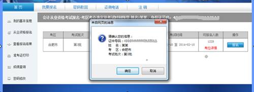 (2)點擊“報名”按鈕時,系統(tǒng)會自動彈出個人信息確認窗口,請仔細核對個人信息,然后單擊“確定”按鈕,如下圖: