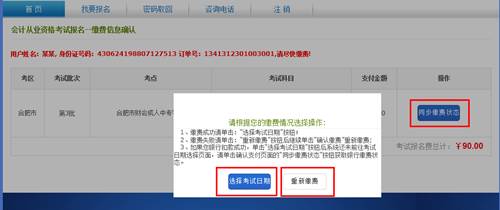 3)、如果您銀行扣款成功,無法“選擇考試日期”,請單擊確認支付頁面的“同步繳費狀態(tài)”按鈕重新獲取銀行繳費狀態(tài)。