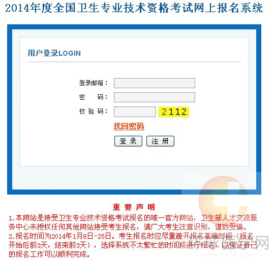 1.注冊用戶:符合報名條件的考生請于網(wǎng)上報名期間登錄中國衛(wèi)生人才網(wǎng),進入“考生入口”欄目中的“網(wǎng)上報名”專區(qū),點擊“2014年度全國衛(wèi)生專業(yè)技術(shù)資格考試網(wǎng)上報名入口”,按要求進行用戶注冊,填寫登錄郵箱、設(shè)置登錄密碼、輸入校驗碼后進入報名界面。