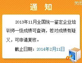 浙江省2013年11月企業培訓師一級全國統考成績查詢入口已經開通,若對成績有疑義,可申請復核。復核截止時間至2014年2月11日。