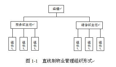 直線制是最簡單的企業管理組織形式,它的特點是:企業各級領導者親自執行全部管理職能,按垂直系統直接領導,不設專門職能機構(如圖1-1所示)。這種組織形式適用于業務量較小的小型物業管理企業的初期管理,不能適應較大規模和較復雜的物業管理。