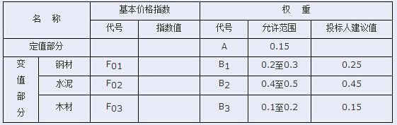 調價公式中,△P為需調整的價格差額;P0為不考慮價格調整、不計質量保證金的扣留和支付、預付款的支付和扣回時,承包人應得到的已完成工程量的金額;A為定值權重;B1、B2、B3為可調因子的變值權重(本例中變值權重采用投標人的建議值);Ft1、Ft2、Ft3為可調因子的現行價格指數;F01、F02、F03為可調因子的基本價格指數。