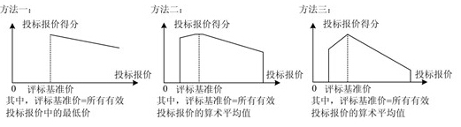 在編制招標方案和招標文件的過程中,招標人擬采用不同的計算方法計算上述三個標包中投標人投標報價得分,用示意圖表示如下: