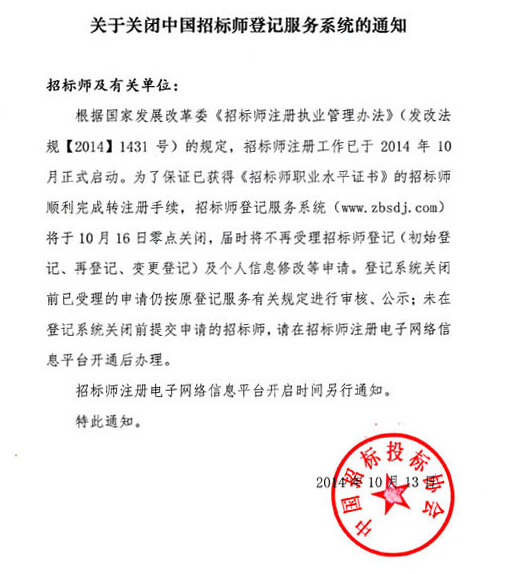 摘要 關于關閉中國招標師登記服務系統的通知:將于2014年10月16日零點關閉,屆時不再受理招標師登記及個人信息修改等申請。