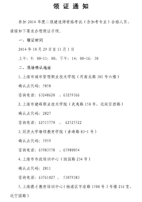 上海2014年二級建造師考試證書領(lǐng)取通知