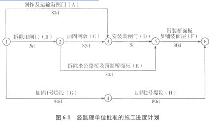 某堤防加固工程依據(jù)《堤防和疏浚工程施工合同范本》簽訂了施工合同,施工內(nèi)容包括防洪閘及堤防加固。其中經(jīng)承包人申請(qǐng)、監(jiān)理單位批準(zhǔn),發(fā)包人同意將新閘門的制作及安裝由分包單位承擔(dān)。合同約定:①當(dāng)實(shí)際完成工程量超過工程量清單估算工程量時(shí),其超出工程量清單估算工程量15%以上的部分所造成的延期由發(fā)包人承擔(dān)責(zé)任;②工期提前的獎(jiǎng)勵(lì)標(biāo)準(zhǔn)為10000元/d,逾期完工違約金為10000元/d。經(jīng)監(jiān)理單位批準(zhǔn)的施工進(jìn)度計(jì)劃如圖6-1所示(假定各項(xiàng)工作均衡施工)。