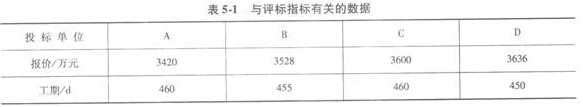 某公開招標(biāo)項(xiàng)目,現(xiàn)有A、B、C、D四家經(jīng)資格審查合格的施工企業(yè)參加該工程投標(biāo),與評(píng)標(biāo)指標(biāo)有關(guān)的數(shù)據(jù)見.表5-1。