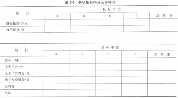 14試在表5-2中填制每個(gè)投標(biāo)單位的各項(xiàng)指標(biāo)得分及總得分。其中報(bào)價(jià)得分要求列出計(jì)算式。請(qǐng)根據(jù)總得分列出名次并確定中標(biāo)單位。