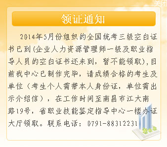 環(huán)球網(wǎng)校從江西省職業(yè)資格工作網(wǎng)了解到,江西省2014年5月份組織的全國統(tǒng)考職業(yè)(含人力資源管理師四三二一級(jí)、心理咨詢師三二級(jí)、企業(yè)培訓(xùn)師三二一級(jí)、理財(cái)規(guī)劃師三二一級(jí)、物流師四三二一級(jí)、秘書資格二級(jí))三級(jí)空白證書已到,目前我中心已制作完畢,(人力資源管理師一級(jí)及職業(yè)指導(dǎo)人員的空白證書未到,暫不能領(lǐng)取),請(qǐng)成績合格的考生和單及單位(考生個(gè)人需帶本人身份證,單位需出示介紹信),在工作時(shí)間至南昌市江大南路19號(hào),省職業(yè)技能鑒定指導(dǎo)中心一樓辦證大廳領(lǐng)取。聯(lián)系電話:0791-88312231