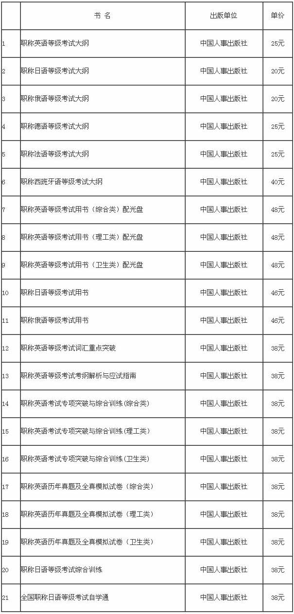 根據(jù)人力資源和社會保障部人事考試中心《關(guān)于做好2015年度全國專業(yè)技術(shù)人員職稱外語等級統(tǒng)一考試用書征訂工作的通知》(人考中心函[2014]57號)文件精神,現(xiàn)就我市征訂考試用書的有關(guān)事項提示考生注意: