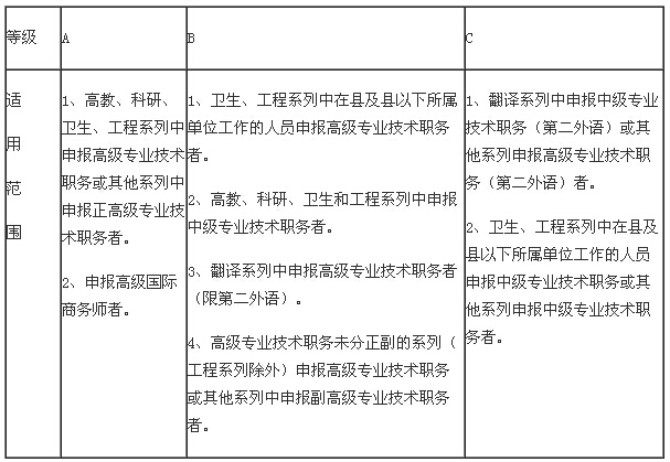 1、考試等級劃分和適用范圍如下表(津人專[1998]42號):