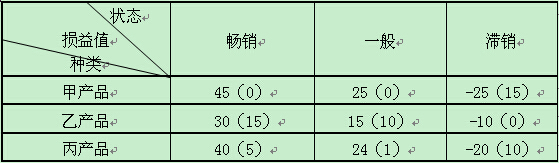 國外某連鎖快餐企業(yè)將目標(biāo)顧客定位于中國市場,近年來不斷生產(chǎn)適合中國人口味的快餐,取得了較好的收入。該企業(yè)和中國另外一家實力強(qiáng)大的快餐A公司各自出資50%,形成一個新的企業(yè),兩家企業(yè)共擔(dān)風(fēng)險,共享利益。為進(jìn)一步提高市場占有率,該企業(yè)以銷售渠道共享的形式與中國某知名快餐B公司結(jié)成戰(zhàn)略聯(lián)盟,在中國多個城市銷售其快餐產(chǎn)品。新型快餐產(chǎn)品方案共有甲產(chǎn)品、乙產(chǎn)品、丙產(chǎn)品三種可供選擇。每種產(chǎn)品方案均存在著暢銷、一般、滯銷三種市場狀態(tài)。每種方案的市場狀態(tài)及損益值如下表所示:單位(萬元)