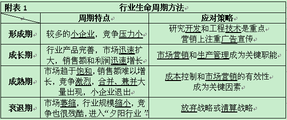 | 行業環境分析 | 行業生命周期法(見附表1) | |