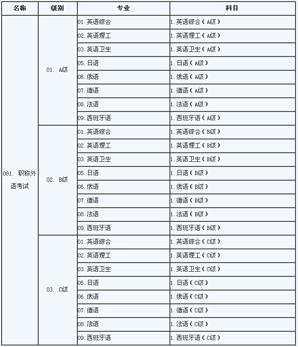 三、2015年度職稱外語考試仍設英語、日語、俄語、德語、法語、西班牙語6個語種,每個語種分為A級、B級、C級3個級別,其中英語每個級別分設綜合、理工、衛生3個專業,其他語種不分設專業。各級別、專業的試題全部為客觀題,在答題卡上作答。我省醫古文和古漢語仍為全省統考,分為A級、B級、C級3個級別,全部為主觀題,在試卷上作答。