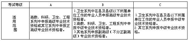 根據《關于調整完善我省職稱外語政策的通知》(粵人發〔2007〕120號),考試等級劃分及適用范圍如下: