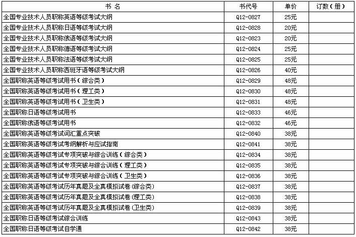 (四)2015年度職稱外語考試用書及輔導用書內容均有修訂,啟用了新版防偽標識。考試用書網上增值服務內容包括2014年職稱外語考試真題答案及解析等,只有正版書讀者才能憑防偽碼在中國人事考試圖書網(http://rsks.class.com.cn)上查看。考試用書輔導用書在原有種類基礎上,新增《全國職稱英語等級考試考綱解析與應試指南》一種。考試用書詳細書目見附件3。