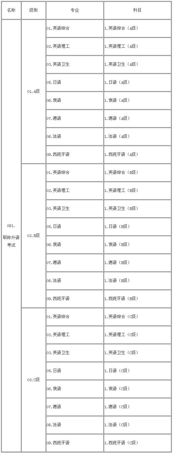 職稱外語考試設6個語種,每個語種分為A級、B級、C級 3個級別,其中英語每個級別分設綜合、理工、衛生3個專業,其他語種不分設專業。考試名稱、級別、專業及科目代碼(見附件1)。