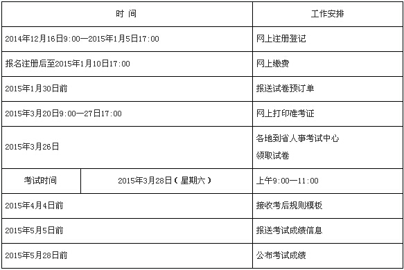 網(wǎng)上注冊時(shí)間為2014年12月16日9:00―2015年1月5日17:00;網(wǎng)上繳費(fèi)時(shí)間為報(bào)名注冊后至2015年1月10日17:00。