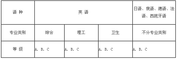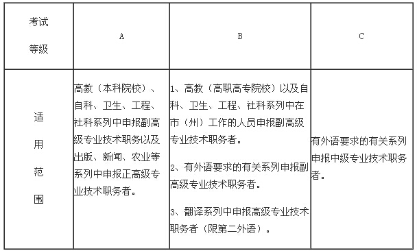 全國職稱外語等級統(tǒng)一考試設(shè)英語、日語、俄語、德語、法語、西班牙語等6個語種,每個語種分為A、B、C三個級別。其中,英語各級別分為綜合、理工、衛(wèi)生3個專業(yè)類別,其它語種不分專業(yè),只分A、B、C三個等級。各專業(yè)類別、等級適用人員詳見表一、表二。