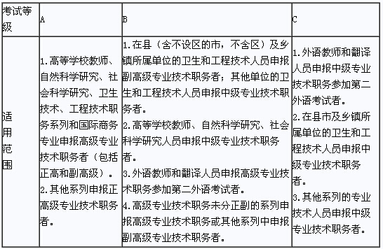 全國專業技術人員職稱外語等級統一考試設“英語、日語、俄語、德語、法語、西班牙語”6個語種,每個語種分為A.B.C三個級別,其中英語每個級別分設綜合、理工、衛生3個專業類別,其他語種不分設專業。按照原人事部《關于專業技術人員職稱外語等級統一考試的通知》(人發〔1998〕54號)規定,凡從事理工、衛生類專業技術工作,職稱外語考試選擇英語的,應分別報考理工、衛生類相應級別。為不影響廣大專業技術人員參加專業技術職務資格評審,凡參加職稱外語考試的人員,應依據原山東省人事廳《關于專業技術人員職稱外語等級考試有關問題的通知》(魯人發〔2001〕97號),嚴格按照等級適用范圍,在任現職期間參加相應級別的考試,不得越級報考。報考人員須根據自己所從事的專業工作,按照等級劃分和規定的適用范圍(見下表),選擇相應語種、級別和類別應試,如有疑問應向所在單位人事部門咨詢。