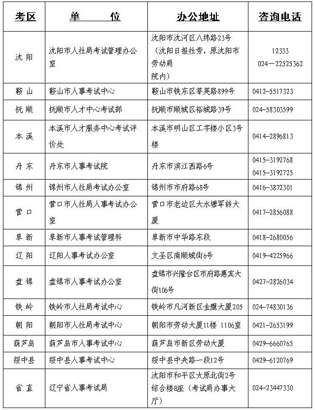 (三)報(bào)名時(shí),我省報(bào)考人員(不含大連考生)請(qǐng)選擇“遼寧省”考區(qū)。駐沈的中、省直單位報(bào)考人員應(yīng)選擇“省直”審核點(diǎn),其他報(bào)考人員均按屬地化管理原則,選擇單位所在市或綏中縣為審核點(diǎn)(報(bào)名有關(guān)事宜咨詢電話詳見(jiàn)附件)。