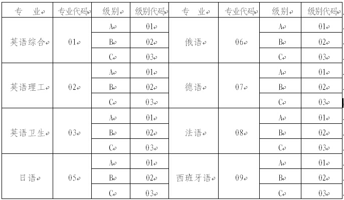 四、全國(guó)職稱外語(yǔ)等級(jí)考試專業(yè)、專業(yè)代碼;級(jí)別、級(jí)別代碼表