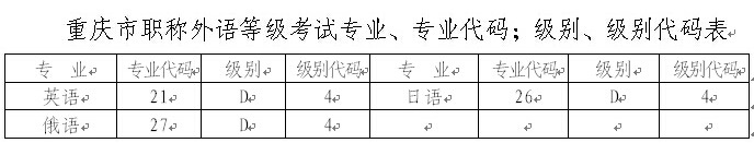 市級(jí)職稱外語(yǔ)等級(jí)考試專業(yè)代碼英語(yǔ)為21,日語(yǔ)為26,俄語(yǔ)為27,級(jí)別代碼D級(jí)為4。