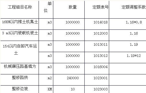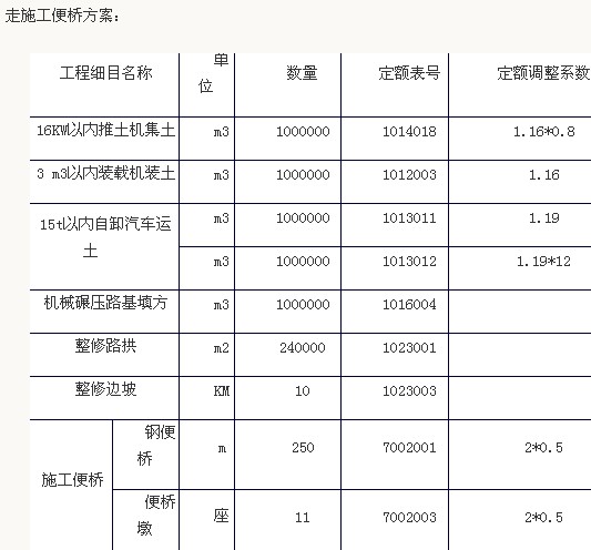 1.分析比較土方運輸方案,一是走舊橋方案,二是走利用并加寬的大橋施工便橋(加寬至8m,50%費用攤入填方內)方案。分別給出兩種運輸方案路基填方的工程細目、工程量及定額表號。
