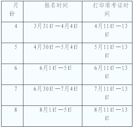 原則上報名當月的中下旬考試,具體考試時間見《準考證》。考生按《準考證》指定的具體時間、地點參加考試。考試時現場照相。