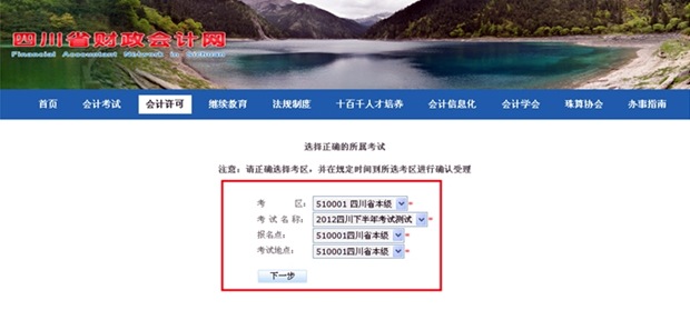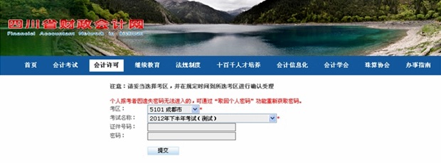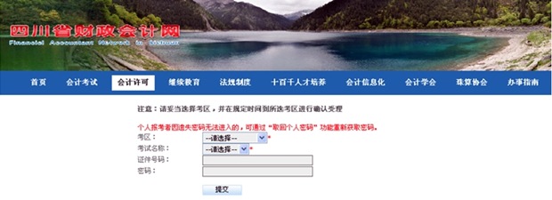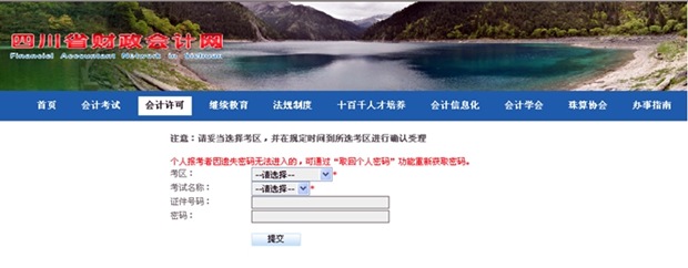 選擇本網站即四川財政會計網(http://221.237.164.66:8080/cms)欄目“會計考試”――“會計從業資格考試”,點擊“報名打印受理單”,選擇考區,考試名稱,填寫證件號、密碼,如下圖所示