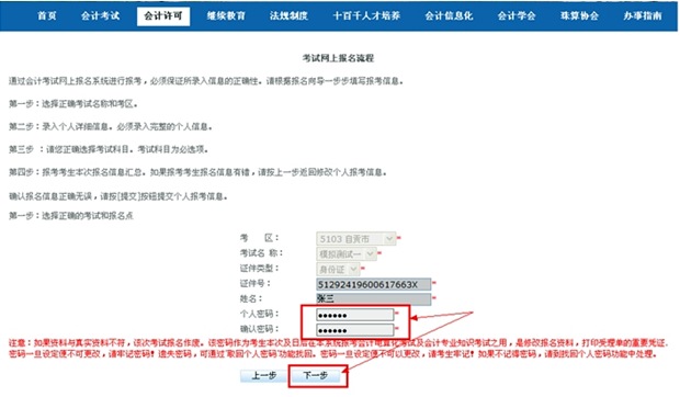 在上圖頁面點擊“下一步”,進入設置從業報名密碼頁面,如下圖所示: