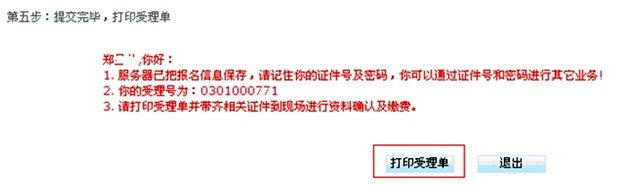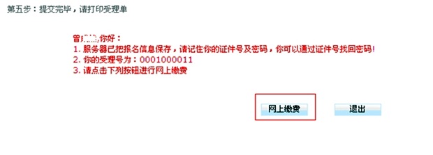 提交后,如是網上繳費的會進入網上繳費頁面,如圖8-1;如是現場繳費的會進入打印受理單頁面,如圖8-2。